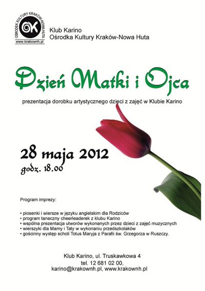 Klub Karino Orodka Kultury Kraków-Nowa Huta (ul. Truskawkowa 4) zaprasza 28 maja 2012 r. (poniedziałek) o godz. 18.00 na imprezę z okazji Dnia Matki i Ojca.