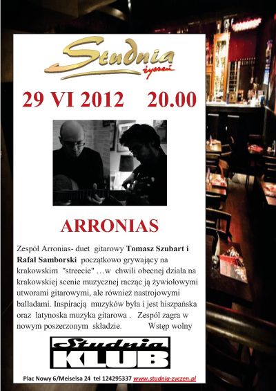 Zesp Arronias- duet gitarowy Tomasz Szubart i Rafa Samborski pocztkowo grywajcy na krakowskim "streecie" w chwili obecnej dziaa na krakowskiej scenie muzycznej raczc j ywioowymi utworami gitarowymi, ale rwnie nastrojowymi balladami. Inspiracj muzykw bya i jest hiszpaska oraz latynoska muzyka gitarowa . Zespl zagra w nowym poszerzonym skadzie. Wstp wolny