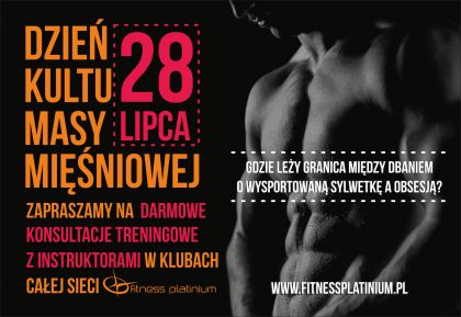 Już po raz kolejny sieć Fitness Platinium oferuje wyjštkowy dzień w swoich klubach! Już 28 lipca, przeprowadzamy zupełnie darmowe konsultacje treningowe z naszymi trenerami personalnymi z okazji Œwiatowego Dnia Kultu Masy Mięœniowej! Konsultacje œwietnie sprawdzš się zarówno u rozpoczynajšcych trening jak i tych, którzy już trenujš i chcš sprawdzić lub poprawić jego efektywnoœć.