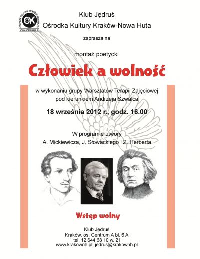 Uczestnicy Warsztatów Terapii Zajęciowej pod kierownictwem Andrzeja Szwalca zaprezentujš utwory poetyckie prezentujšce zagadnienie człowieka wobec pojęcia wolnoœci. Podczas spotkania przybliżone zostanš wiersze Adama Mickiewicza, Juliusza Słowackiego i Zbigniewa Herberta.