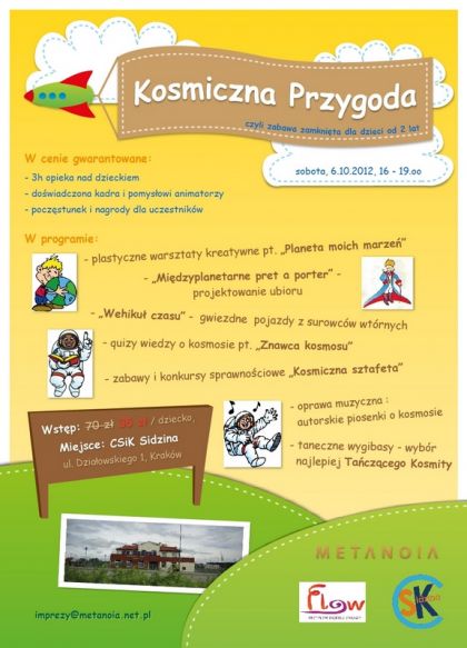 W sobotę 6 paŸdziernika CSiK Sidzina oraz kawiarnia Metano!a (ul. Działowskiego 1 w Krakowie) zapraszajš na kalejdoskop zabaw dla dzieci od 2 roku życia zatytułowany: "Kosmiczna przygoda". Bardzo pomysłowe panie animatorki pobudzš wyobraŸnię dzieci na temat Kosmosu, kosmonautów i astronomii.
