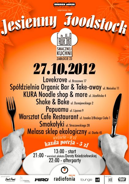27 padziernika w Klubie Fabryka na krakowskim Zabłociu odbędzie się wyjštkowe wydarzenie kulinarne. Wnętrza klubu zamieniš się w jednš, dużš restaurację, targ albo po prostu sala biesiadnš. Ten dzień to Jesienny Foodstock, pierwsza impreza z autorskiego cyklu Fabryki: Fabryka smacznej kuchni. Alternatywny klub to również alternatywne, nietypowe smaki, do współpracy zostały zaproszone restaurację, które stawiajš na nowatorskie i zdrowe potrawy. Firmy otwarte na nowe wyzwania, jakim niewštpliwie jest gotowanie w nietypowych, industrialnych przestrzeniach.