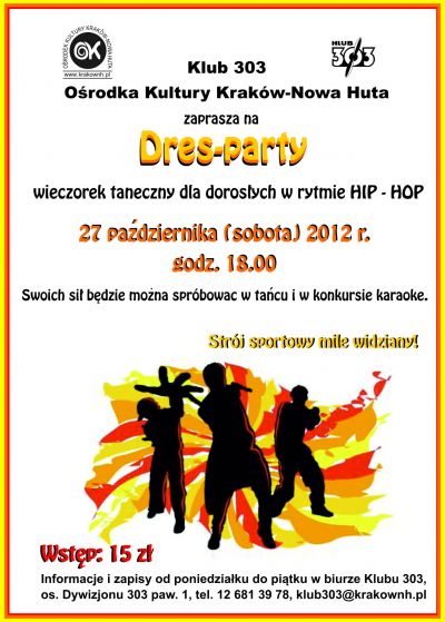 Klub 303 Orodka Kultury Krakw-Nowa Huta (os. Dywizjonu 303 nr 1) serdecznie zaprasza 27 padziernika 2012 r. (sobota) o godz. 18.00 na wieczorek taneczny w rytmie hip-hop i nie tylko.