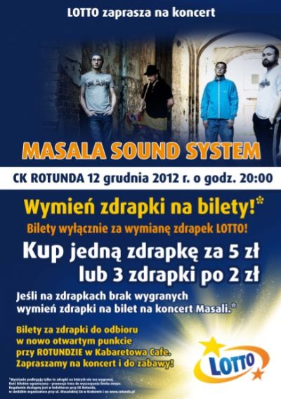 Wymie zdrapki na bilety. Kup jedn zdrapk za 5 z lub 3 zdrapki po 2 z. Jeli na zdrapkach brak wygranych wymie zdrapki na bilet na koncert Masali. Bilety za zdrapki do obioru w nowo otwartym punkcie Lotto przy Rotundzie w Kabaretowa Cafe. Zapraszamy na koncert i do zabawy!