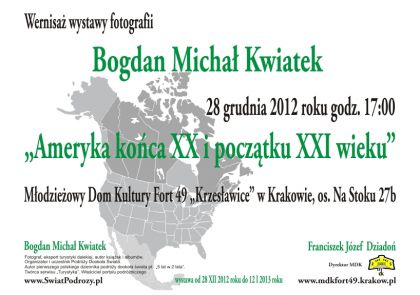 Wystawa Ameryka końca XX i poczštku XXI wieku prezentuje zdjęcia Bogdana Michała Kwiatka zrobione podczas podróży do Ameryki Północnej. Tematem wystawy sš w szczególnoci Stany Zjednoczone oraz Kanada (miasta, parki narodowe, ludzie i krajobrazy) w dwóch okresach czasowych. Relacja fotograficzna prezentowana przez autora przedstawia Amerykę z lat 90-tych XX wieku oraz podobne miejsca 20 lat póniej. Fotografie pochodzš z cyklu 13 wystaw pt. 5 lat w 2 lata- czyli podróż dookoła wiata jakš autor odbył w latach 1992-95 w tzw. 500-tnš rocznice Odkrycia Ameryki. Wystawie zdjęć towarzyszyć będzie prezentacja ksišżek autora pt: 5 lat w 2 lata,