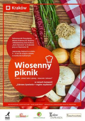 Pełnomocnik Prezydenta Miasta Krakowa ds. Rodziny i Młodzieżowy Dom Kultury „Dom Harcerza” w Krakowie przy ul. Reymonta 18 zapraszają chętnych w wieku 5 – 12 lat do wzięcia udziału w konkursie kulinarnym „Wiosenny piknik” z cyklu  „Gotuj i jedz z głową – smacznie i zdrowo!” w ramach kampanii „Zdrowe żywienie = mądre myślenie”.