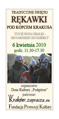 Czy to tylko odpust odbywający się w trzeci Dzień Świąt Wielkanocnych pod Kościółkiem św. Benedykta, czy też ślad prastarych obrzędów słowiańskich? Od 2001 roku Dom Kultury "Podgórze" organizuje Rękawkę w innej formie - wraca do jej prasłowiańskich korzeni - umożliwiając cofnięcie się w czasie o sześć wieków. Pod Kopcem Krakusa można zobaczyć jak wyglądało życie we wczesnośredniowiecznych osadach, rzemiosło, uzbrojenie, stroje. Można spróbować potraw gotowanych według przepisów naszych przodków i zobaczyć jak wyglądały średniowieczne potyczki zbrojne. Uzupełnieniem jest możliwość poznania historii Kopca Krakusa, państwa Wiślan i Polan.