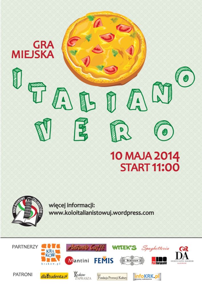 10 maja 2014 to może być sobota pełna słońca i niecodziennych zagadek. Możecie znaleźć się w Neapolu drugiej połowy XIX w. i poznać współczesną wersję świty Małgorzaty Sabaudzkiej nie wyjeżdżając poza granice Krakowa. Możecie połączyć naukę z zabawą, a przy tym zdobyć cenne nagrody, bo na pachnącą pizzą grę miejską zaprasza Koło Naukowe Italianistów Uniwersytetu Jagiellońskiego.