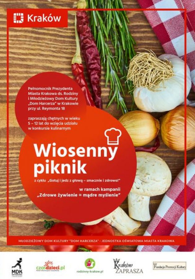 Pełnomocnik Prezydenta Miasta Krakowa ds. Rodziny i Młodzieżowy Dom Kultury „Dom Harcerza” w Krakowie przy ul. Reymonta 18 zapraszają chętnych w wieku 5 – 12 lat do wzięcia udziału w konkursie kulinarnym „Wiosenny piknik” z cyklu „Gotuj i jedz z głową – smacznie i zdrowo!” w ramach kampanii „Zdrowe żywienie = mądre myślenie”.
