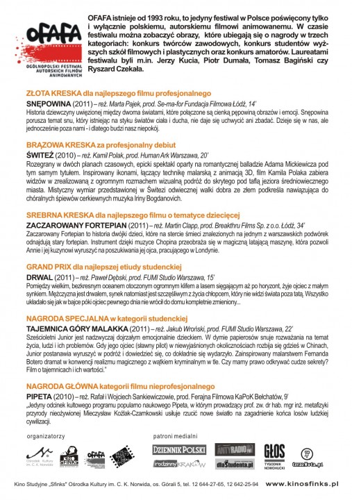 Pokaz filmów nagrodzonych na 17.OGÓLNOPOLSKIM FESTIWALU AUTORSKICH FILMÓW ANIMOWANYCH OFAFA 2012