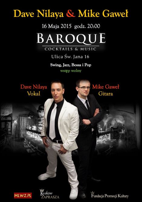 16 maja w sobotę serdecznie zapraszamy na koncert włosko-polskiego duetu Dave Nilaya - wokal & Michał Gaweł - gitara, który odbędzie się w klubie BAROQUE Coctails & Music.