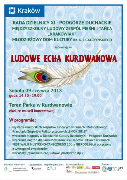 Ludowe Echa Kurdwanowa odbędą się po raz 3. Jego organizatorem jest Międzyszkolny Ludowy Zespół Pieśni i Tańca „Krakowiak” i MDK im. K.I. Gałczyńskiego. Wydarzenie ma na celu promowanie kultury i sztuki ludowej (w tym rękodzielniczej), a także wzmacnianie więzi lokalnych. Jego adresatami są mieszkańcy dzielnicy XI Krakowa Podgórze Duchackie, jak również miłośnicy i pasjonaci folkloru. W programie pojawią się m.in. występy amatorskich zespołów folklorystycznych z Małopolski i okolic. To za sprawą XI MAŁOPOLSKIEGO PRZEGLĄDU ZESPOŁÓW FOLKLORYSTYCZNYCH SMOK 2018, który to przegląd jest jednym z punktów wydarzenia. Ponadto przez cały czas trwania Ludowych Ech Kurdwanowa odbywać się będzie szereg warsztatów (tj. m. in. warsztaty z ceramiki, warsztaty malowania drewnianych ptaków, warsztaty z tkactwa artystycznego, warsztaty z koronki klockowej i wiele innych). Prócz tego zainteresowanym stworzona zostanie możliwość zakupienia regionalnej żywności takiej jak pieczywo, sery, czy miody. W trakcie trwania wydarzenia zostanie również wręczona Nagroda w Dziedzinie Kultury Dzielnicy XI - Podgórze Duchackie, a także wręczenie nagród dla laureatów Konkursu Tańców Polskich połączone z występami zwycięzców konkursu. Honorowy patronat nad Ludowymi Echami Kurdwanowa objęła dzielnica XI Miasta Krakowa Podgórze Duchackie.