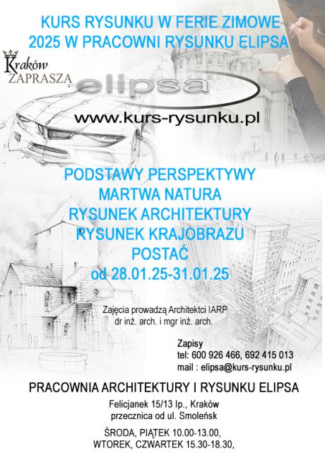 Wykorzystaj czas w okresie ferii zimowych kreatywnie. Naucz się czegoś nowego i poznaj tajniki rysunku przestrzennego, tajemnice i podstawy perspektywy, których nie znajdziesz w żadnych książkach. Zapisz się na zajęcia w Pracowni Rysunku Elipsa. Rysunku uczymy od ponad dekady, posiadamy duże doświadczenie pedagogiczne i dorobek naukowy oraz konstruktywnie i zrozumiale przekazujemy wiedzę n.t. rysunku i innych technik. Jeżeli polubisz rysowanie i stanie się ono twoją pasją, możesz podjąć dłuższą naukę i wybrać dla siebie odpowiedni kierunek, a w efekcie zdać i dostać się na studia wyższe jak Architektura, Wzornictwo Przemysłowe, Projektowanie Wnętrz, Architektura Krajobrazu, Grafika i inne, lub aplikować do Licem Plastycznego (rysujemy dużo martwych natur). Jeżeli już uczęszczasz na zajęcia lub uczęszczałeś w innej szkole rysunku, ten kurs również jest dla Ciebie, podszkolisz swoje umiejętności oraz doszlifujesz warsztat pod okiem czynnych zawodowo projektantów oraz pracowników Politechniki Krakowskiej.