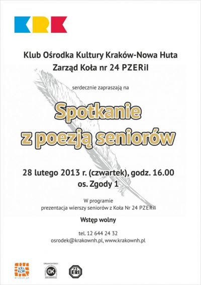 Klub Ośrodka Kultury Kraków-Nowa Huta (os. Zgody 1) zaprasza 28 lutego 2013 r. o godz. 16.00 na prezentację wierszy seniorów z Koła nr 24 PZERiI, których tematyka dotyczyć będzie przeżyć osobistych autorów, a także spraw związanych z historią, Ojczyzną i współczesnym światem. Celem spotkania jest promowanie amatorskiej twórczości poetyckiej oraz podniesienie poziomu zainteresowania literaturą. Współorganizatorem spotkania jest Zarząd Koła 24.