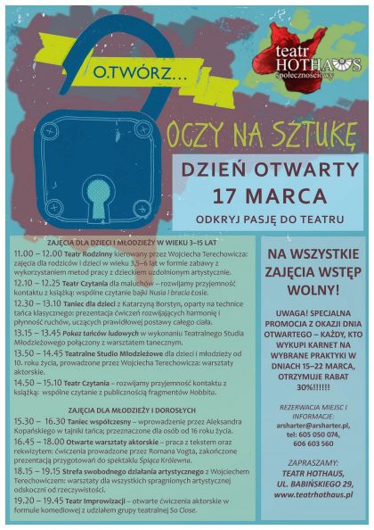 Przez cały dzień każdy będzie miał okazję przyjrzeć się i wziąć udział w zajęciach artystycznych, jakie na co dzień odbywają się w Teatrze Hothaus.