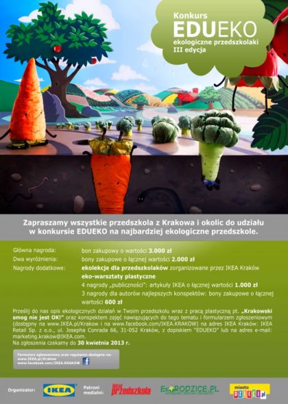 Do konkursu EDUeko przystąpić może każde przedszkole z powiatu krakowskiego, które aktywnie propaguje działania na rzecz środowiska i angażuje się w edukację ekologiczną najmłodszych. Akcja ma inspirować do eko-zachowań zarówno zarządzających placówkami, opiekunów grup, jak i same maluchy. Dlatego zadaniem przedszkoli, biorących udział w konkursie, jest nie tylko przedstawienie opisu podejmowanych przez nie działań proekologicznych, ale również zaproponowanie konspektu zajęć pod hasłem „Krakowski smog nie jest OK!”. Przedszkolaki natomiast zostaną zaangażowane do przygotowania wspólnej pracy plastycznej, nawiązującej do tego tematu. Zgłoszenia przyjmowane są do 30 kwietnia 2013 r.