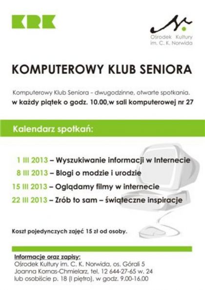 Zapraszamy na warsztaty w ramach KOMPUTEROWEGO KLUBU SENIORA działającego w Ośrodku Kultury im. C. K. Norwida w Krakowie. Proponujemy ciekawe spotkania w przyjemnej atmosferze przybliżające tajniki pracy z komputerem i Internetem.