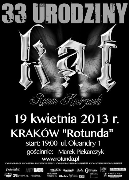 bilety:35 zł. -w przedsprzedaży/45zł. - w dniu koncertu. Do nabycia w kasie Rotundy od poniedziałku do piątku w godzinach od 16.00-19.00 oraz na www.ticketpro.pl (http://www.ticketpro.pl/jnp/muzyka/1051584-kat-roman-kostrzewski-33-urodziny.html) oraz w sklepach sieci EMPiK, Media Markt,Saturn Planet, Carton Shop. Bilety VIP - 100 zł, (numerowane miejsce na balkonie wraz z powitalnym prezentem na barze do nabycia w kasie klubu