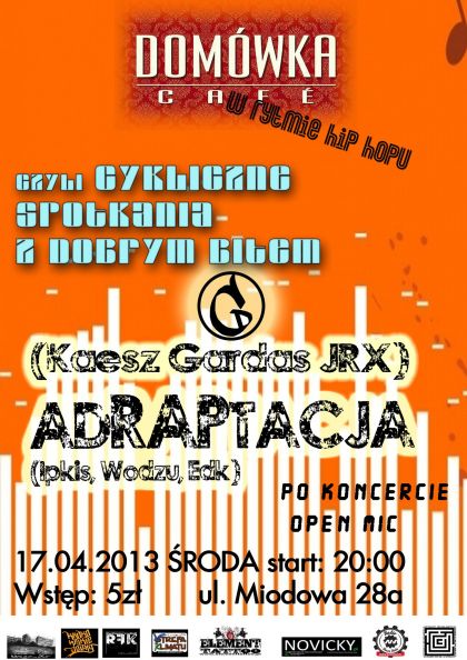 Już po raz drugi Domówka Cafe (ul. Miodowa 28a) udostępnia swoją scenę krakowskim freestylowcom. Tym razem w ramach Domówka w rytmie Hip-Hop czyli cykliczne spotkania z dobrym bitem 17.04 koncert dadzą dwa składy: O.D.C i AdRAPtacja.
