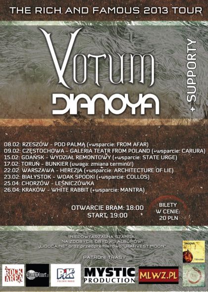 Już 26 Kwietnia w klubie "White Rabbit" w Krakowie zagoszczą dwie nadzieje polskiego progrocka - Votum oraz Dianoya. Obie formacje kontynuują tym samym polską trasę koncertową „The Rich & Famous Tour 2013” promującą najnowsze wydawnictwa zespołów - „Harvest Moon” oraz „Lidocaine”. Gościnnie zobaczymy również zespół Mantra.