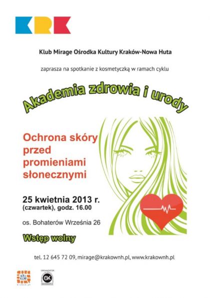 Zapraszamy panie na kolejne spotkanie w ramach cyklu porad zdrowotno - kosmetycznych organizowanych przez Klub Mirage Ośrodka Kultury Kraków-Nowa Huta (os. Bohaterów Września 26). Najbliższe spotkanie pod hasłem Ochrona skóry przed promieniami słonecznymi odbędzie się 25 kwietnia br. o godz. 16.00.