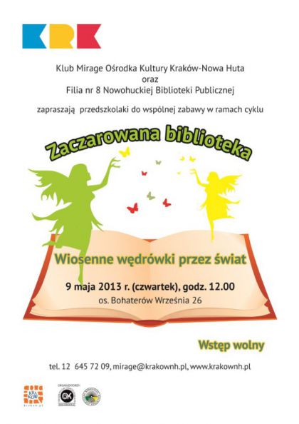 Klub Mirage Ośrodka Kultury Kraków-Nowa Huta (os. Bohaterów Września 26) zaprasza 9 maja br. o godz. 12.00 na kolejne zajęcia edukacyjno–relaksacyjne dla przedszkolaków z cyklu Zaczarowana biblioteka.