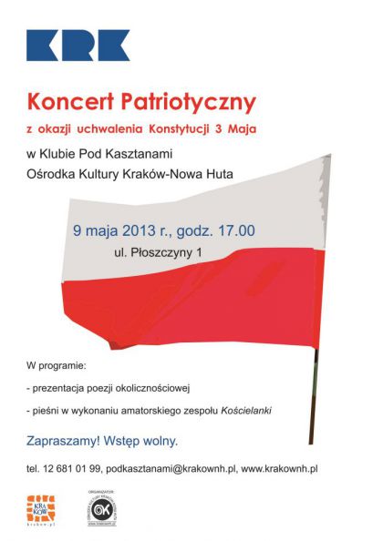 Klub Pod Kasztanami Ośrodka Kultury Kraków-Nowa Huta (ul. Płoszczyny 1) zaprasza 9 maja br. o godz. 17.00 na koncert patriotyczny z okazji uchwalenia Konstytucji 3 Maja.