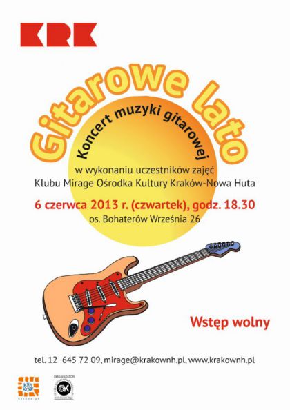Z okazji zakończenia roku kulturalnego Klub Mirage Ośrodka Kultury Kraków-Nowa Huta (os. Bohaterów Września 26) zaprasza 6 czerwca o godz. 18.30 na koncert uczestników zajęć gitarowych w Klubie.