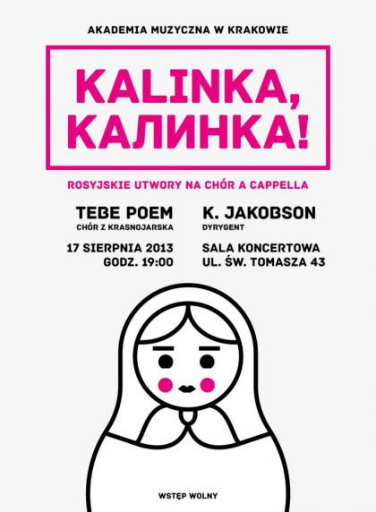 17 sierpnia br. o godzinie 19:00 w Sali Koncertowej Akademii Muzycznej w Krakowie (ul. św. Tomasza 43) wystąpi chór TEBE POEM z Krasnojarska. Artyści wystąpią pod batutą znakomitego dyrygenta, a zarazem założyciela chóru - Konstantina Jakobsona. Podczas tego wyjątkowego wydarzenia śpiewacy wykonają rosyjskie utwory na chór a capella. Chór TEBE POEM występował m.in. w Stanach Zjednoczonych, Argentynie, Francji, Holandii i Szwajcarii wielokrotnie zbierając entuzjastyczne opinie zarówno wśród odbiorców, jak i krytyków.