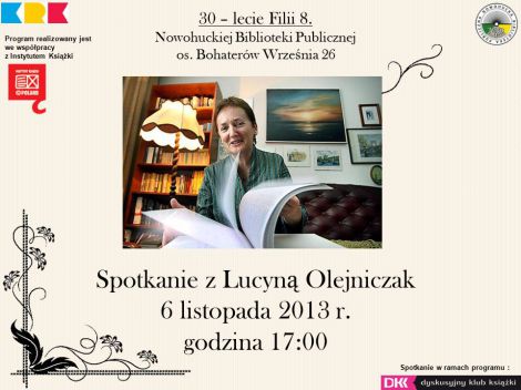 Filia nr 8 Nowohuckiej Biblioteki Publicznej w Krakowie zaprasza na obchody 30-lecia swojej działalności. Gościem specjalnym spotkania będzie Lucyna Olejniczak, pisarka, mieszkanka Krakowa, z zawodu laborantka medyczna, były pracownik Katedry Farmakologii Uniwersytetu Jagiellońskiego. Działalnością pisarską zajęła się po powrocie ze Stanów Zjednoczonych, wtedy powstała jej pierwsza powieść "Opiekunka, czyli Ameryka widziana z fotela". Jest laureatką konkursu "Moje podwórko" zorganizowanego w 2002 roku przez krakowską "Gazetę Wyborczą". Jej pozostałe książki to: "Dagerotyp. Tajemnica Chopina", "Wypadek na ulicy Starowiślnej" i "Jestem blisko". Dla fanów autorki jest to wyjątkowa okazja, by się z nią spotkać, porozmawiać, zdobyć autograf i miło spędzić popołudnie. Serdecznie zapraszamy!!!