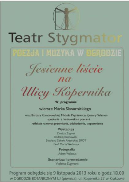 W programie: "Jesienne liście na Ulicy Kopernika" - wiersze m.in.: Barbary Komorowskiej, Joanny Salamon, Michał Piętniewicza, Marka Skwarnickiego; wspomnienia i refleksje o przemijaniu, spotkanie z poetami współpracującymi z Klubem Artystyczno-Literackim Teatru "Stygmator" m.in.:Andrzejem Kalinowskim, Jerzy Piątkowskim, Elżbietą Kutą.