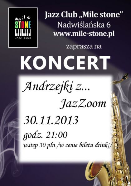 Zapraszamy na andrzejkowy wieczór z JazZoom. Specjalnie dla Was zespół zagra to co kachają najbardziej: muzykę pełną swingu, smooth jazz, funk oraz ognistą sambę i nastrojową bossa novę. Usłyszycie zarówno dobrze znane standardy jazzowe jak i własne kompozycje śpiewane w języku polskim. Nie zabraknie też przebojów muzyki rozrywkowej w nowych, jazzowych aranżacjach.