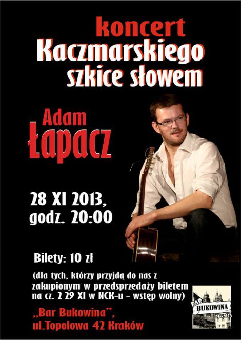 Jacek Kaczmarski zostawił nam ogrom literackich tekstów, z których większość nie o polityce mówi (jak utarło się te utwory klasyfikować) a o historii, kulturze i sztuce. Tym razem proponujemy Państwu program, który w całości poświęcony będzie właśnie tej ostatniej kategorii – zabierzemy Was w świat ekfraz Jacka Kaczmarskiego, czyli jego utworów pisanych do obrazów i o obrazach wielkich mistrzów polskiego i światowego malarstwa. Kaczmarski szkicuje nam słowem grafiki Norblina, Gielniaka i Picassa, maluje przed nami świat z obrazów Matejki, Boscha, Bruegela i innych, Adam Łapacz zaś pozwoli zaistnieć zarówno utworom autora „Alegorii malarstwa”, jak i dziełom wspomnianych malarzy (koncert będzie miał również wymiar audiowizualny). Zatem, zanim wybierzecie się do Muzeum, zapraszamy do Śródmiejskiego Ośrodka Kultury, gdzie poznacie, czasem zaskakujące, interpretacje tych bardziej i mniej znanych dzieł sztuki. Ten koncert to zaledwie część pierwsza, preludium do większego projektu muzyczno-literacko-malarskiego, którego dalszy ciąg będziecie Państwo mogli zobaczyć już dnia następnego.