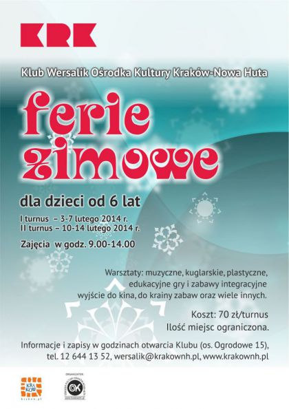 Co zrobić w sytuacji, gdy zima nie mamy na ferie możliwości wyjazdu poza miasto i trzeba spędzić ten czas w mieście? Zapraszamy dzieci na zajęcia do Klubu Wersalik Ośrodka Kultury Kraków-Nowa Huta (os. Ogrodowe 15).