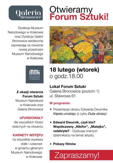 Dyrekcja Muzeum Narodowego w Krakowie oraz Dyrekcja Galerii Bronowice serdecznie zapraszają na otwarcie Forum Sztuki – nowej przestrzeni Muzeum Narodowego w Krakowie.
