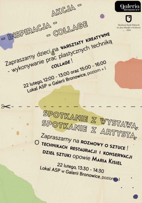 Spotkania ze sztuką rozpoczną się zajęciami dla dzieci pt. „Akcja-inspiracja”. Najmłodsi zapoznają się z techniką artystyczną collage, czyli formowaniem kompozycji z różnego rodzaju materiałów i tworzyw. Niesamowita przygoda z dziełami sztuki europejskiej wciągnie dzieci do magicznego świata – każdy będzie mógł malować, rysować, rzeźbić i tworzyć. - Taka podróż w wyobraźnię jest świetnym sposobem zdobywania wiedzy i gwarancją szerokiego rozwoju poprzez zabawę. Najmłodsi będą więc mogli rozwinąć swoje zdolności, nauczyć się ekspresji i odkryć własny potencjał twórczy – mówi Natalia Buchta, wykładowca z krakowskiej ASP, autorka wielu warsztatów opartych na treningu twórczości i rozwoju wyobraźni.