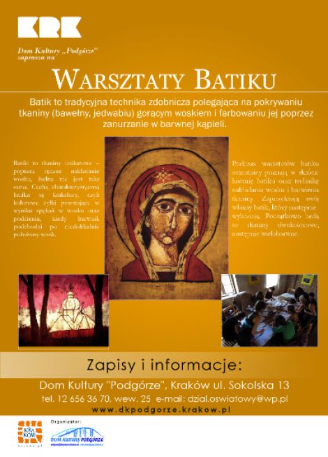 Dom Kultury Podgórze zaprasza na warsztaty technika nakładania wosku i barwienia tkaniny. Każdy z uczestników będzie mógł zaprojektować i wykonać swój własny obraz.