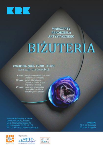 Zapraszamy do Centrum Kultury "Ruczaj" na warsztaty rękodzieła artystycznego. W maju uczestnicy dowiedzą się jak tworzyć biżuterię. Zajęcia prowadzi Krystyna Drożdżowska – jubiler, twórca rękodzieła artystycznego, która od wielu lat tworzy biżuterię, kapelusze, ozdobne dodatki do ubioru, a także przedmioty sztuki użytkowej.