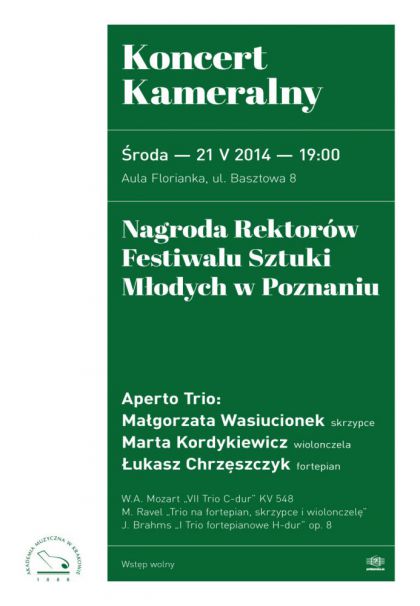 21 maja o godz. 19:00 w Auli „Florianka” zagra dla nas trio w składzie: Małgorzata Wasiucionek – skrzypce, Marta Kordykiewicz – wiolonczela oraz Łukasz Chrzęszczyk – fortepian.