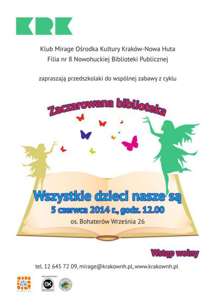 Klub Mirage Ośrodka Kultury Kraków-Nowa Huta (os. Bohaterów Września 26) zaprasza 5 czerwca o godz. 12.00 na spotkanie dla przedszkolaków w ramach cyklu Zaczarowana biblioteka. Warsztaty prowadzone w oparciu o bajki takie jak Brzydkie kaczątko czy Calineczka poświęcone będą zagadnieniu tolerancji. Współorganizatorem wydarzenia jest Filia nr 8 Nowohuckiej Biblioteki Publicznej.