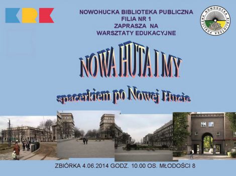 Warsztaty edukacyjne odbędą się w cyklu: „Edukacja regionalna”. Będzie to spacer po zabytkach i ciekawych, najbardziej rozpoznawalnych miejscach Nowej Huty, które dzięki swojej architekturze i specyfice urbanistycznej tworzą niepowtarzalny klimat. Przewodnikiem będzie animator ze Stowarzyszenia „Szersze Horyzonty”, który opowie również o początkach powstawania miasta zbudowanego dla pracowników kombinatu metalurgicznego, a 1 stycznia 1951 włączonego do Krakowa jako jedna z jego dzielnic. Zwrócenie uwagi uczestników spaceru na wartości duchowe, intelektualne i materialne przyczyni się do identyfikacji z Małą Ojczyzną i zachęci do aktywnego i świadomego udziału w życiu wspólnoty lokalnej jaką jest Nowa Huta.