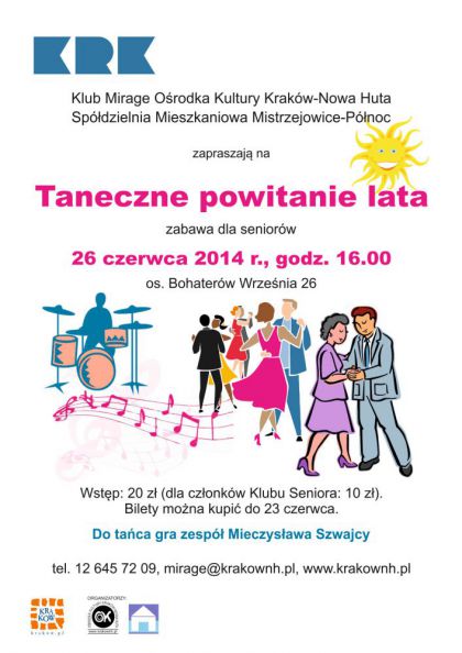 Klub Mirage Ośrodka Kultury Kraków-Nowa Huta (os. Bohaterów Września 26) zaprasza 26 czerwca 2014 r. o godz. 16.00 na zabawę taneczną dla seniorów z okazji zakończenia czwartkowych spotkań w Klubie. Do tańca zagra zespół Mieczysława Szwajcy, a dla wszystkich gości przewidziano słodki poczęstunek oraz napoje.