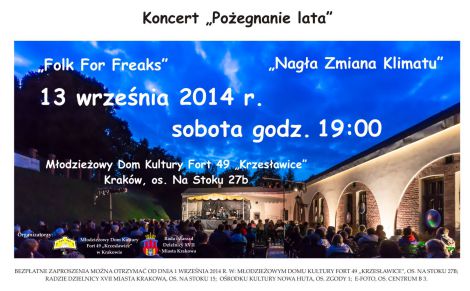W sobotę 13 września 2014, o godz 19:00 na dziedzińcu fortecznym, Młodzieżowego Domu Kultury odbędzie się koncert z cyklu „Pożegnanie lata”. Na scenie wystąpią zespoły: Folk For Freaks oraz Nagła Zmiana Klimatu.