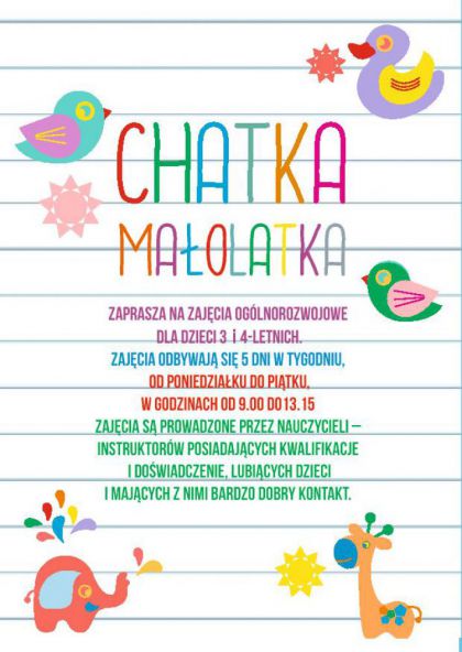 Zapraszamy na zajęcia ogólnorozwojowe dla dzieci 3- i 4-letnich. Zajęcia odbywają się 5 dni w tygodniu, od poniedziałku do piątku, w godzinach od 9.00 do13.15 i są prowadzone przez nauczycieli – instruktorów posiadających kwalifikacje, doświadczenie i mających bardzo dobry kontakt z dziećmi.