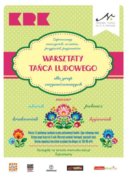 Zorganizowane grupy animatorów i nauczycieli serdecznie zapraszamy na warsztaty tańca ludowego. Podczas jednego, 3,5-godzinnego spotkania możemy nauczyć podstawowych kroków i figur dowolnie wybranego przez grupę polskiego tańca ludowego.