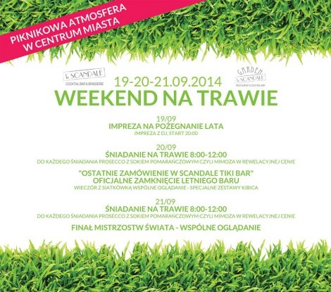Mimo, że astronomiczne lato kończy się z dniem 23 września, to tak na prawdę dla wielu staje się to na początku miesiąca, wraz z końcem wakacji i coraz krótszym dniem a dłuższą nocą. Aby nie zapominać o tej porze roku i przygotować się na "niepogodę" Le Scandale i Garden Le Scandale zapraszają na WEEKEND NA TRAWIE, podczas którego podobnie jak w zeszłym roku wszystko się zazieleni za sprawą prawdziwej ... trawy!
