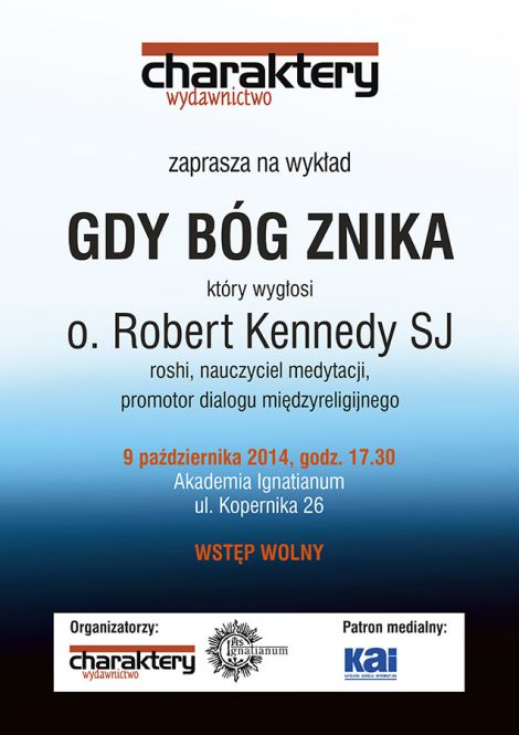 Wydawnictwo Charaktery zaprasza na otwarty wykład "Gdy Bóg znika" o. Roberta Kennedy’ego w Polsce. O. Robert Kennedy jest jezuitą i mistrzem zen. Święcenia otrzymał w Japonii, gdzie praktykował i studiował zen u Roshiego Kouna Yamady. Po powrocie do Stanów Zjednoczonych w 1998 roku, kontynuował buddyjskie studia oraz praktykę zen. Jako pierwszy ksiądz katolicki w USA otrzymał honorowy tytuł Roshi. Kieruje Katedrą Teologii w Saint Peter’s College w Jersey City. Jest praktykującym psychoterapeutą w Nowym Jorku. Wydawnictwo Charaktery w ubiegłym roku wydało jego książkę pt. Dary zen dla chrześcijan.