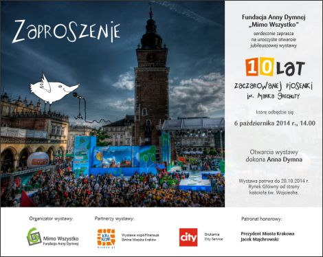 6 października, o 14.00, na Rynku Głównym w Krakowie, Anna Dymna otworzy plenerową wystawę „10 lat Festiwalu Zaczarowanej Piosenki im. Marka Grechuty”. Pierwsza edycja tego trzyetapowego konkursu dla utalentowanych wokalnie osób niepełnosprawnych odbyła się w 2005 roku. W dziesięciu finałach wystąpiło 124 piosenkarzy. Towarzyszyło im 58 największych gwiazd polskiej sceny muzycznej.