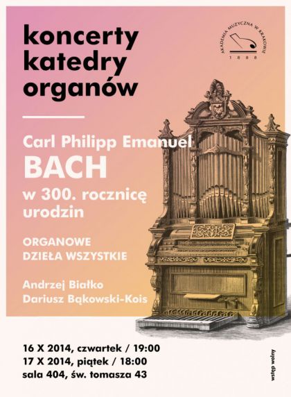 W ramach obchodów roku Carla Philippa Emanuela Bacha (1714-1788) profesorowie Andrzej Białko i Dariusz Bąkowski-Kois z Katedry Organów Akademii Muzycznej w Krakowie wykonają, w ramach czterech półrecitali, organowe dzieła wszystkie Kompozytora. Serdecznie zapraszamy na dwa koncerty organowe do sali 404: w czwartek 16 października 2014 na godz. 19.00 oraz w piątek 17 października 2014 na godz. 18.00. WSTĘP WOLNY!