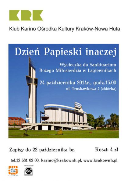 W ramach tegorocznych obchodów Dnia Papieskiego Klub Karino Ośrodka Kultury Kraków-Nowa Huta (ul. Truskawkowa 4) zaprasza na wycieczkę do Łagiewnik.